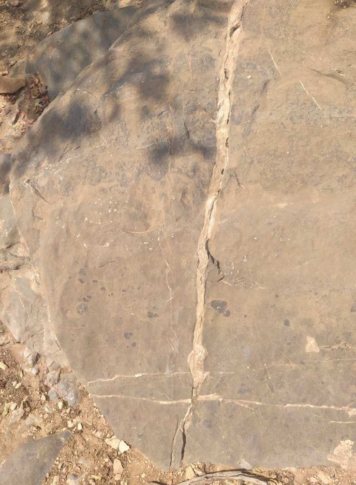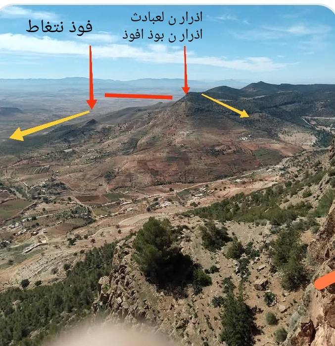 الصورة لصاحبها مشكور،اخذتها لأهميتها بالنسبة للمنشور الاسهم الصفراء هو اتجاه ميل الطبقات الرسوبية الجيرية ،شمال غرب والأخرى جنوب شرق.. الخط الاحمر قطر الفالق